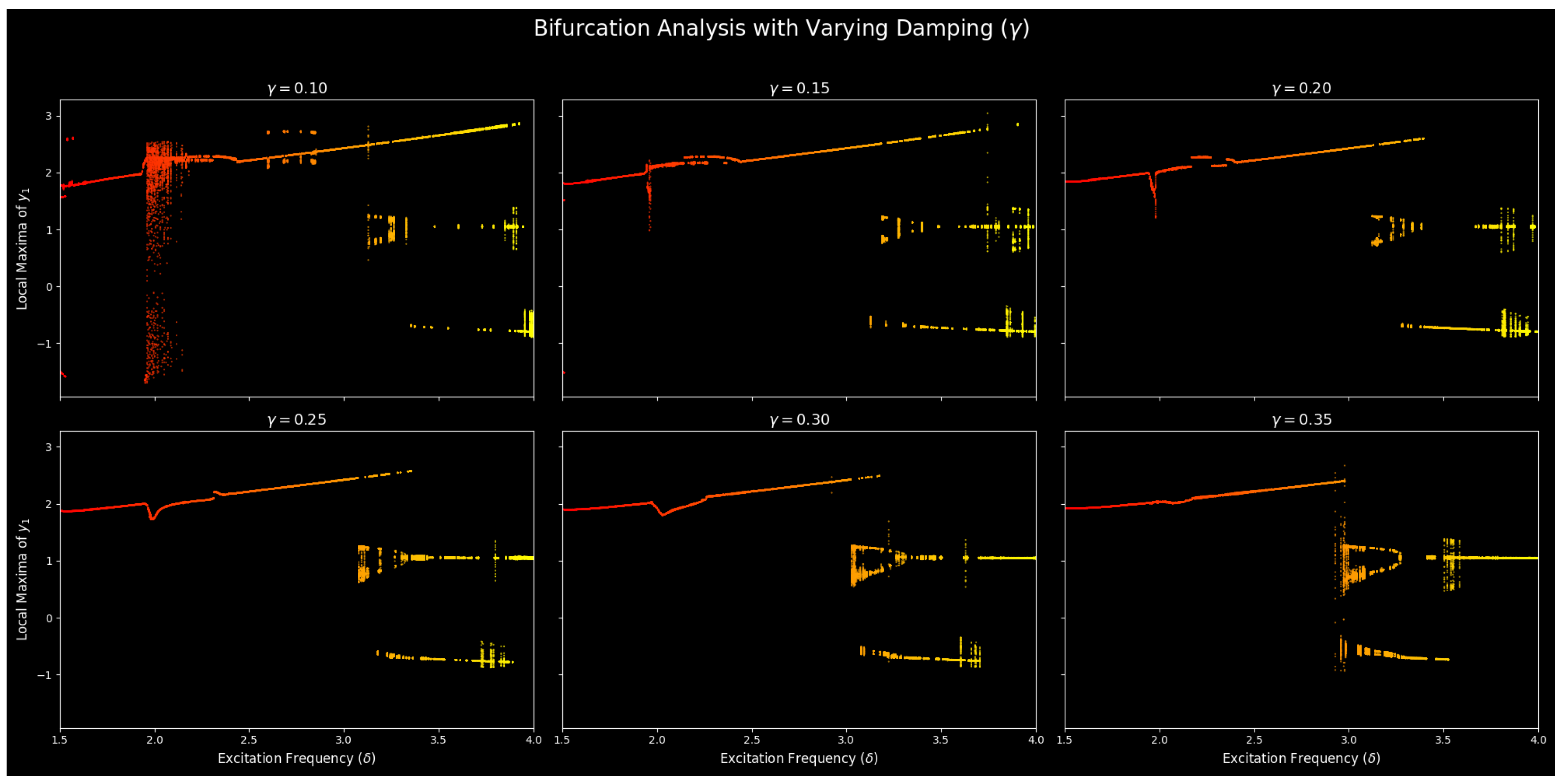 • Case 3: High amplitude ( γ 0.30 ): With increased damping, the chaos transition is smoother and organized. To achieve a period-doubling cascade, the major route is still the period-doubling cascade, but it now begins with larger excitation frequencies ( δ ), and its overall extent of chaotic motion is smaller. This action underlines the stabilizing influence of the damping being enhanced that smothers the scale and the amount of the chaotic dynamics.