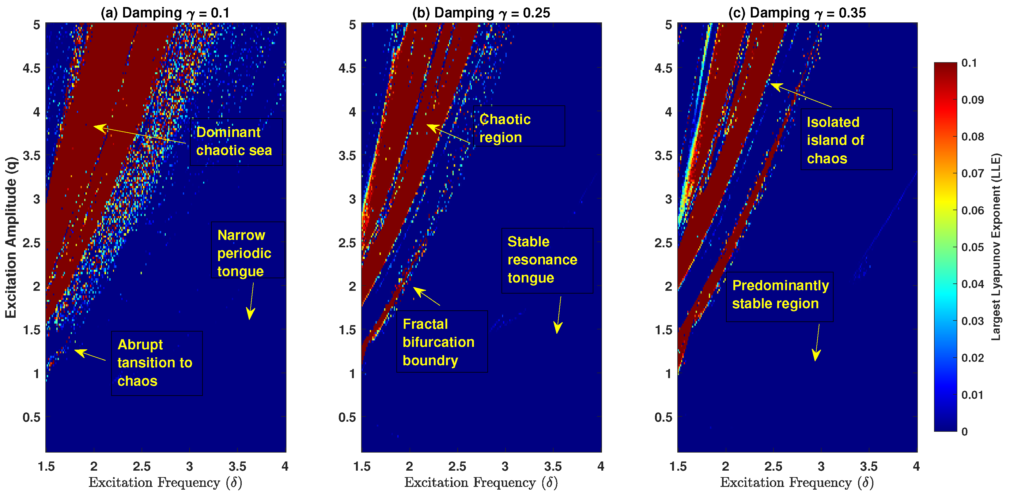 Figure 4. Stability diagrams for the DM-CQDO in the excitation frequency ( δ ) and amplitude (q) parameter space for three different damping coefficients: (a) low damping ( γ = 0.1 ), (b) intermediate damping ( γ = 0.25 ), and (c) high damping ( γ = 0.35 ). The color indicates the value of the LLE, with warmer colors (red/yellow) signifying chaos and darker colors (blue) signifying periodic or stable motion. The annotations highlight key dynamical features, such as the chaotic sea, periodic tongues, and bifurcation boundaries.
