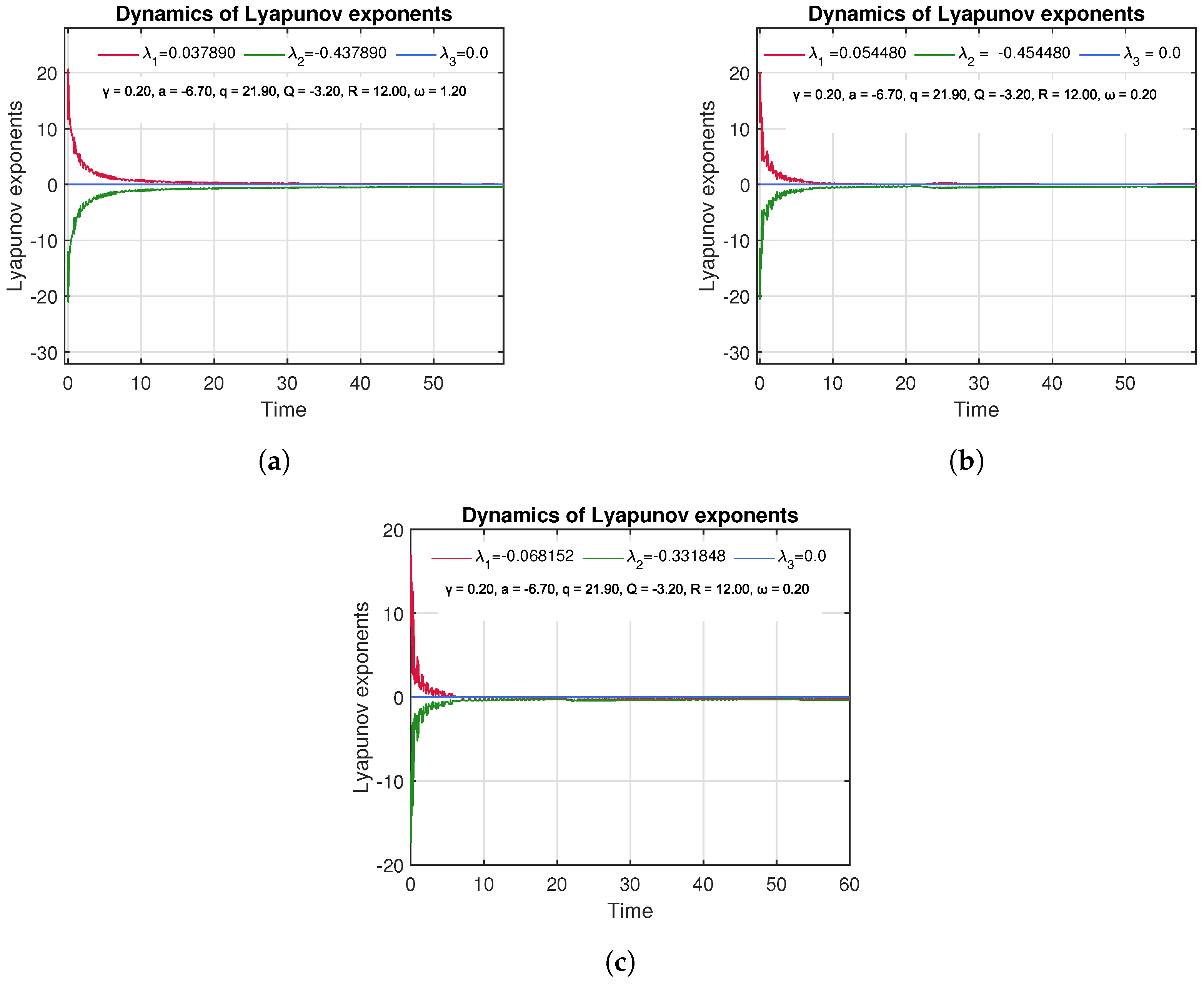 Figure 5. Lyapunov spectra for three different initial conditions: (a) y 1 = 0.01 , y 2 = 0.01 , y 3 = 0.01 , (b) y 1 = 0.3 , y 2 = 0.3 , y 3 = 0.3 , (c) y 1 = 0.5 , y 2 = 0.5 , y 3 = 0.5 . The plots illustrate variations in the largest Lyapunov exponent ( λ 1 ) across time, highlighting the system’s sensitivity to initial states. (a,b) show positive λ 1 , indicating chaotic behavior, while (c) shows a negative λ 1 , indicating stable, non-chaotic dynamics. This figure emphasizes the coexistence of multiple attractors and the influence of initial conditions on system stability.