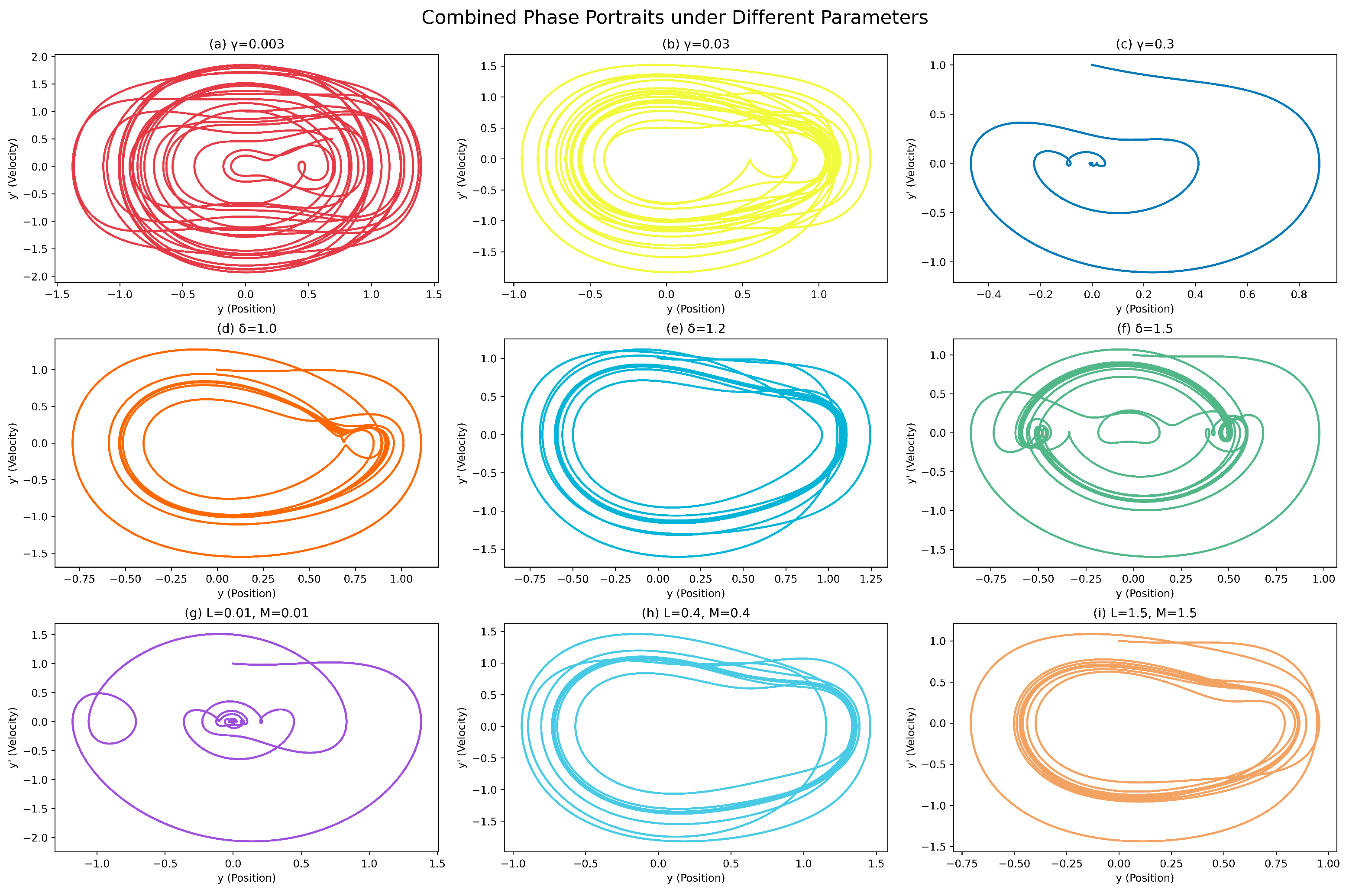 Figure 9. Phase-space trajectories of DM-CQDO under varying system parameters. (ac) Evolution of attractors with increasing damping coefficients γ = 0.003 , 0.03 , and 0.3 , respectively, illustrating the suppression of oscillatory behavior. (df) Influence of the parametric excitation frequency δ = 1.0 , 1.2 , and 1.5 , highlighting its role in destabilizing or sustaining periodic orbits. (gi) Effect of increasing nonlinear stiffness parameters ( L , M ) = ( 0.01 , 0.01 ) , ( 0.4 , 0.4 ) , and ( 1.5 , 1.5 ) , showing transitions from near linear to strongly nonlinear regimes. The trajectories are plotted in the phase plane ( y , y ) for fixed initial conditions, emphasizing the emergence of multi-stable behavior.