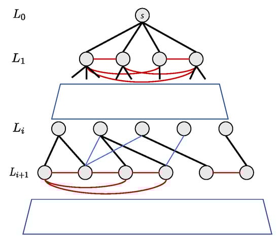Illustration of edge classification in a BFS spanning tree. Tree-edges are black, strut-edges are blue, and horizontal-edges are red.