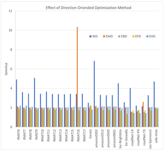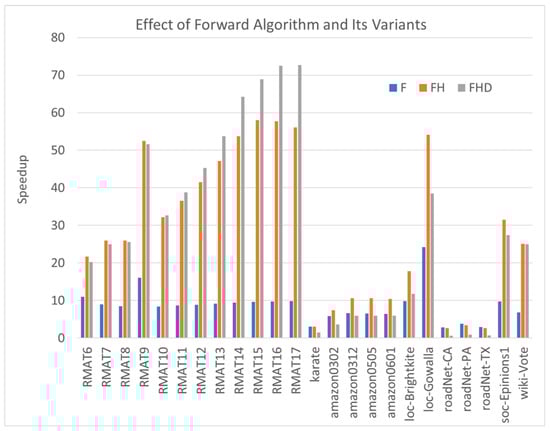 A noteworthy trend is identified when evaluating the results, particularly concerning the RMAT graphs. Our finding reveals that the forward algorithm and its variants tend to perform the fastest. As the scale of the RMAT graph increases, the parameter c decreases, indicating a more substantial removal of fruitless checks after BFS. Under these conditions, our novel method demonstrates greater efficiency compared to the F algorithms.