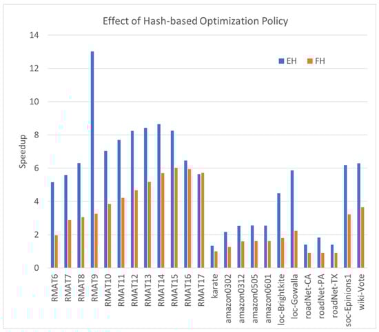 Chiba and Nishizeki [19] proposed one of the earliest edge-iterator algorithms using hashing for triangle enumeration. Its runtime is , where denotes the arboricity of G, bounded by [19]. In 2018, Davis [20] rediscovered this method—referred to as tri_simple—in his comparison using SuiteSparse GraphBLAS. Mowlaei [21] introduced a variant of the edge-iterator algorithm employing vectorized sorted set intersection and vertex reordering based on the reverse Cuthill–McKee heuristic.