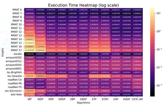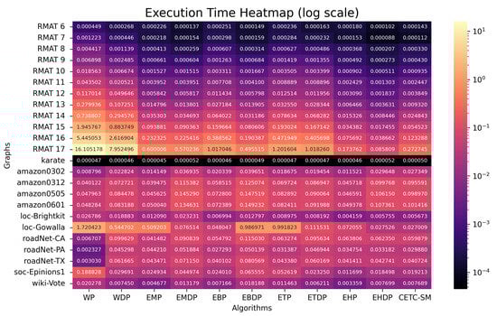However, certain scenarios highlight limitations. For instance, in the case of the small-sized graph “karate”, all parallel algorithms fail to exhibit performance improvements. This can be attributed to the inherent overhead of the OpenMP parallel method, which outweighs the benefits for very small graphs. A similar pattern is observed for the graph RMAT 6, where three parallel methods—EHP, EHDP, and CETC-SM—show no performance improvement. As previously mentioned, the baseline algorithms EH, EHD, and CETC-Seq have already demonstrated high performance, and the parallel overhead for small graphs nullifies the potential benefits of parallelization.