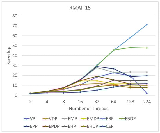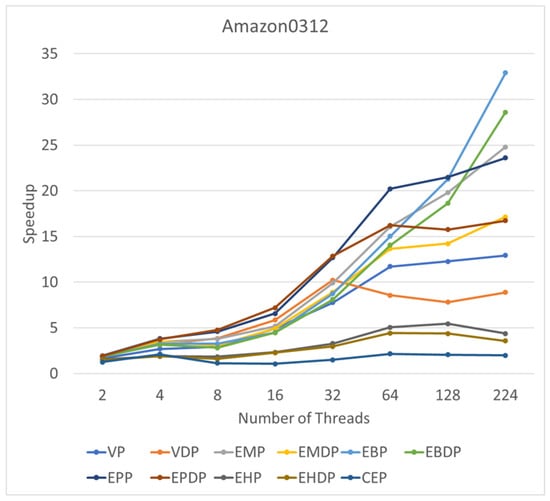 This subsection delves into the performance of these algorithms in response to varying thread counts. We use RMAT 15 as an illustrative example of a synthetic graph and Amazon0312 as a representative instance of a real graph. By progressively increasing the number of threads to 2, 4, 8, 16, 32, 64, 128, and 224, we seek to identify changes in speedup corresponding to increasing thread counts.