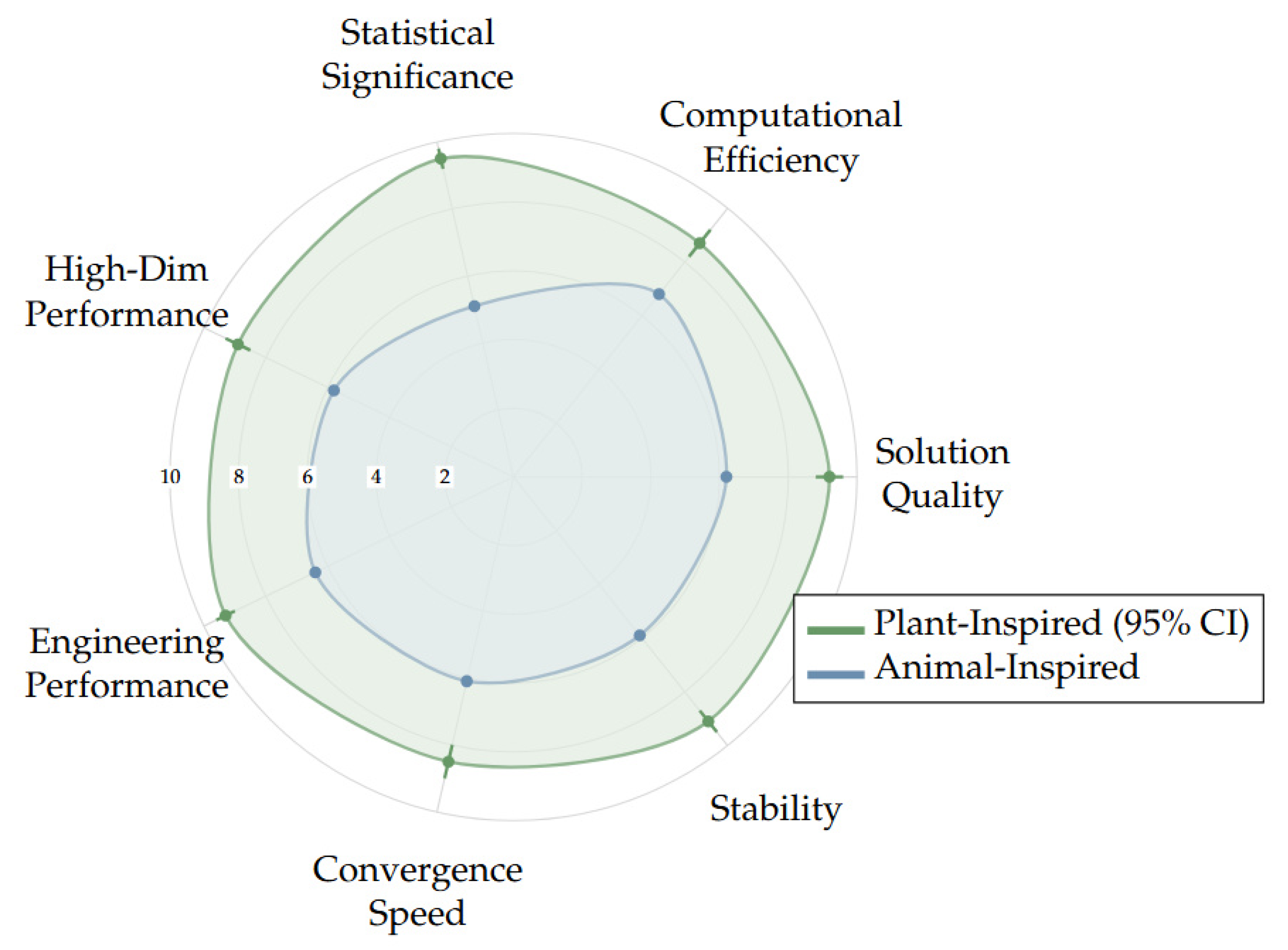 While numerous reviews on bio-inspired algorithms exist, our work is differentiated by its specific focus and methodology. Broad surveys like Jakšić et al. (2023) provide a comprehensive overview of applications in fields like nanophotonics but offer limited depth on the plant-inspired sub-category [98]. Application-specific reviews, such as Younis et al. (2022) on solar cell parameter extraction, offer deep analysis in a narrow domain but do not compare algorithmic paradigms more broadly [99]. Our review is the first to use the PRISMA systematic methodology to conduct a direct, quantitative meta-analysis comparing the empirical performance of plant-inspired algorithms against their dominant animal-inspired counterparts, thereby uniquely documenting the performance-versus-representation disparity.