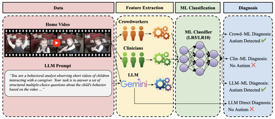 Overview of the experimental pipeline for LLM-based autism detection. The workflow consists of four stages: (1) data collection from home videos with structured prompts, (2) feature extraction through crowdworkers, clinicians, and LLMs to generate behavioral ratings, (3) ML classification using validated LR5/LR10 classifiers, and (4) diagnosis generation through both ML-assisted and direct approaches. The pipeline demonstrates the comparative evaluation framework for assessing LLM performance against human baselines.