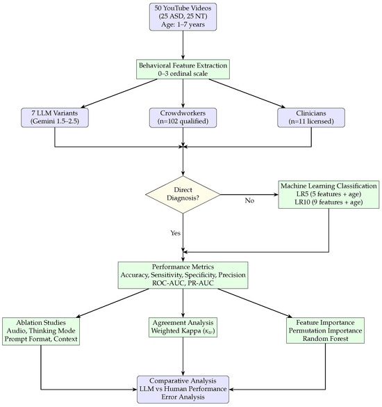 Detailed flowchart of the experimental methodology. The workflow begins with 50 YouTube videos, proceeds through behavioral feature extraction using multiple choice questions, evaluates three groups of raters (LLMs, crowdworkers, and clinicians), and then branches based on direct diagnosis assessment. If direct diagnosis is performed (yes), the workflow bypasses ML classification and proceeds directly to performance evaluation. If not (no), features are processed through machine learning classifiers (LR5/LR10) before performance evaluation. The methodology culminates in a comprehensive analysis including agreement analysis, feature importance analysis, and ablation studies. Purple boxes indicate data/results, green boxes represent processing steps, and the yellow diamond shows the decision point for direct diagnosis assessment.