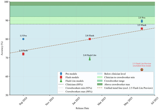 Our results demonstrate performance gains across model generations, with accuracy improving from 72.0% (±1.8) in Gemini 1.5 Flash to 89.6% (±2.1) in Gemini 2.5 Pro using the LR5 classifier—representing a 24.4% relative improvement over 15 months of model development. The progression follows a consistent upward trajectory: the 1.5 series achieved 72–80% accuracy, the 2.0 series reached 80%, and the 2.5 series attained 85–90% accuracy. This advancement, visualized by the trend line in Figure 3 (excluding the 2.5 Flash Lite Preview outlier, explained later in this section), shows a least squares regression with a slope of 0.0402 accuracy percentage points per day (, ). However, this linear projection should be interpreted with caution. The observed trajectory may represent the early phase of a logistic growth curve that will eventually plateau as models approach theoretical performance limits. The temporal progression could follow a logarithmic, rather than linear, scale—a possibility we cannot definitively assess with seven data points spanning 15 months. Therefore, the fitted trend line should be interpreted as characterizing recent historical progress, rather than as a predictive model, acknowledging that the true functional form of advancement may differ from the linear approximation shown.