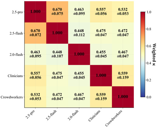 Pairwise inter-rater reliability matrix showing weighted kappa coefficients between all rater groups. Individual LLM models (2.5 Pro, 2.5 Flash, 2.0 Flash) demonstrate near-perfect within-model consistency (diagonal values ) but moderate between-model agreement (–).