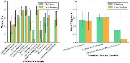Feature-level and domain-level inter-rater agreement of Gemini 2.5 Pro with clinicians and Gemini 2.5 Pro with crowdworkers. (Left) Individual behavioral features show high variability in agreement, with language-related features demonstrating the highest concordance. (Right) Domain-level aggregation reveals systematic differences, with Stereotyped Behaviors showing notably lower reliability than the Language and Social domains.