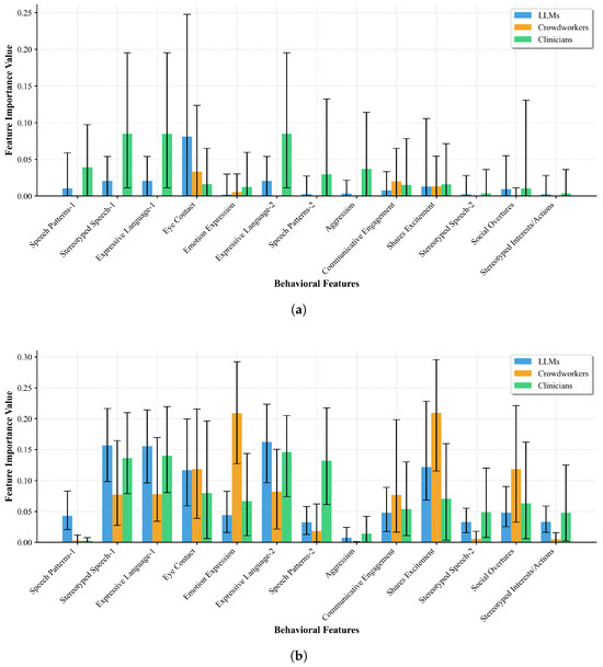 While numerous fully automated approaches have been developed for autism detection from remote video and audio data, including multimodal fusion methods [60], audio-based classification, and feature-specific prediction models [21,61,62], these remote assessment methods consistently underperform in comparison to human-in-the-loop approaches when analyzing home videos. Specifically focusing on audiovisual classification from naturalistic home settings, Serna-Aguilera et al. [24] achieved 82% accuracy, Kojovic et al. [25] reported 80.9%, and Liu et al. [26] demonstrated 76% accuracy—all below the 92–98% accuracy achieved by crowdworker approaches on similar home video data [17]. Additionally, these deep learning methods function as black-box classifiers that cannot provide feature-level interpretability or explain which specific behaviors drive their predictions. This limitation prevents meaningful comparison with human annotators at the behavioral feature level, which is essential for understanding diagnostic reasoning and ensuring clinical validity. Our work, therefore, focuses on comparing multimodal LLMs with human-in-the-loop approaches, as both can provide interpretable, feature-level assessments that enable direct analysis of how different evaluators prioritize and interpret behavioral markers.