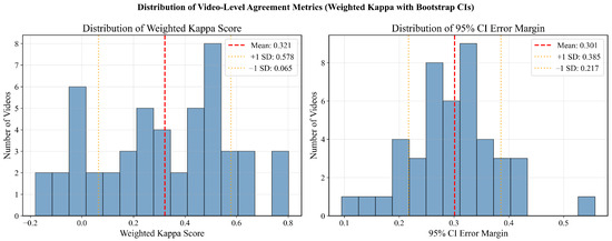 Figure 4 presents pairwise weighted kappa coefficients across all rater groups. Individual LLM models achieved exceptional within-model consistency when evaluated across multiple runs: Gemini 2.5 Flash demonstrated near-perfect agreement (, 95% CI: [0.992, 1.000]), followed by Gemini 2.0 Flash (, 95% CI: [0.982, 0.995]) and Gemini 2.5 Pro (, 95% CI: [0.889, 0.941]). This consistency exceeds human rater agreement, where crowdworkers achieved (95% CI: [0.413, 0.740]) and clinicians showed (95% CI: [0.165, 0.862]) using balanced 3-rater sampling per video.