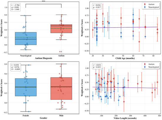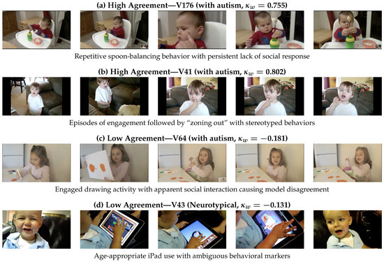 We utilized the same 50 YouTube videos analyzed by Washington et al. [17], comprising 25 children with parent-reported autism diagnoses and 25 neurotypical controls, balanced by gender (52% male, 48% female). Children ranged from 1 to 7 years (mean: 3.5 years, SD: 1.7 years), representing the typical age range for autism screening. Videos were recorded in naturalistic home settings, averaging 171.3 ± 105.0 s in duration, and captured unstructured play and social interaction scenarios. All videos met three inclusion criteria essential for behavioral assessment: (1) the child’s face and hands were clearly visible, (2) opportunities for social engagement with caregivers or siblings were present, and (3) the child interacted with toys or objects enabling the assessment of play behaviors. This dataset has been extensively validated in prior crowdsourcing studies, with parent-reported diagnoses confirmed through clinical severity ratings [17].