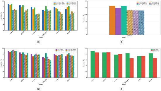 Performance trajectories across model generations were analyzed using least squares regression to project improvement trends. For ablation studies, we evaluated the contribution of individual components by comparing model performance with and without each feature. Effects are reported as percentage-point differences in accuracy between configurations. Specifically, we examined the following: (1) thinking mode (enabled vs. disabled for 2.5 series models), (2) multimodal input (video + audio vs. video-only), (3) context inclusion (behavioral questions provided with vs. without diagnostic query), and (4) prompt format (binary vs. three-choice response options). These comparisons enabled us to quantify the relative importance of each technical component for reliable behavioral assessment.