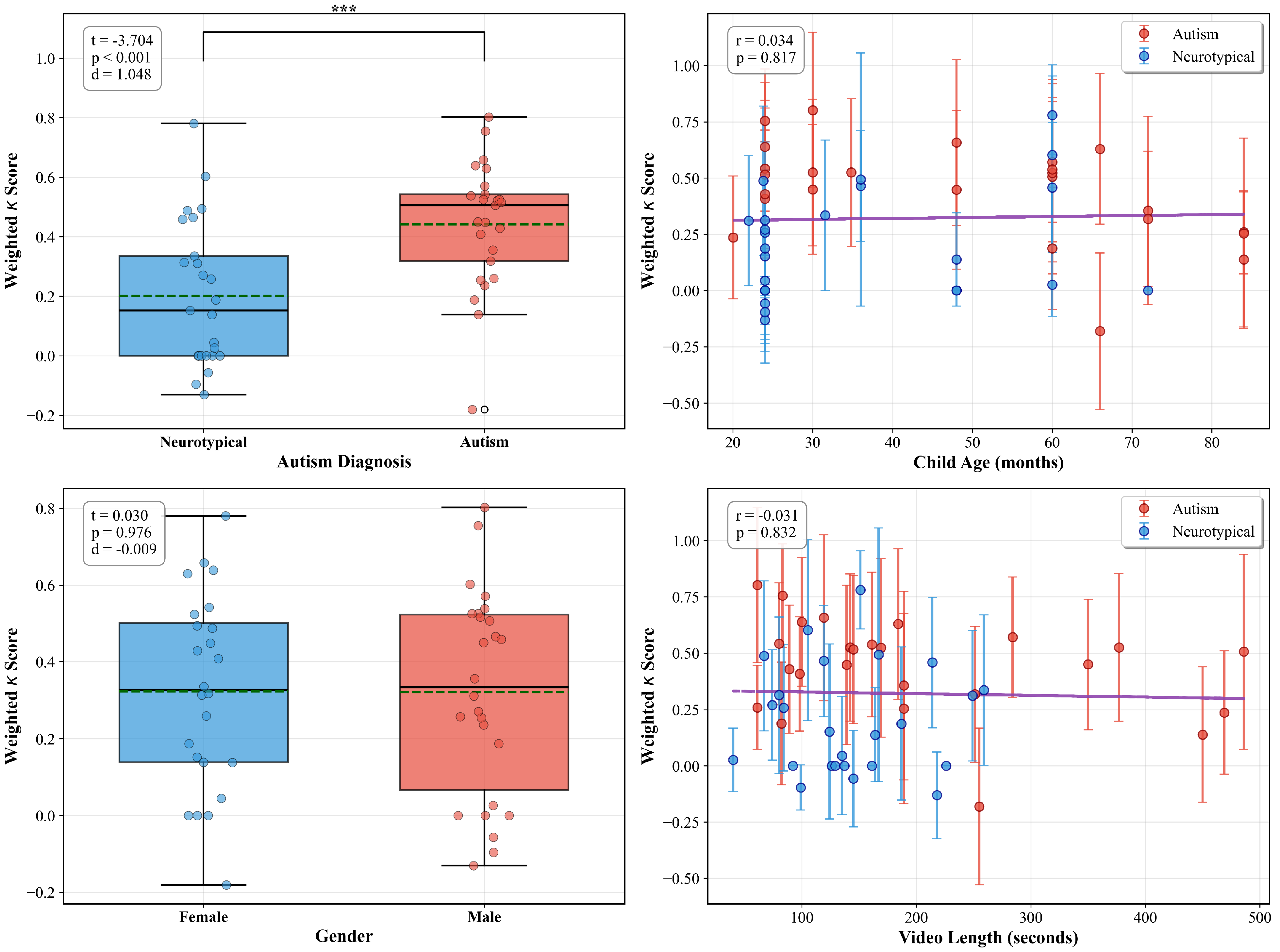 | V15 | ASD | Yes | Diagnosed: ASD Temporal mapping: “0:38–0:42: Caregiver calls name…glances briefly”; “1:15–1:20: Repetitive hand movements”; chronological pattern analysis | Diagnosed: ASD Categorical analysis: “1. Social Interaction Deficits”; “2. Communication Challenges”; “3. Restricted, Repetitive Patterns” |