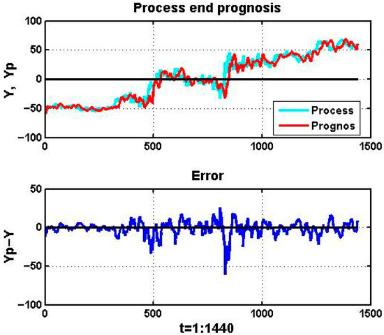 To illustrate this point, Figure 6 presents results for a 24-h observation interval with training window L = 50 and forecast horizon τ = 20. The observed process is shown in blue, while red curves denote forecasts. The lower panel reports the forecast error, defined as