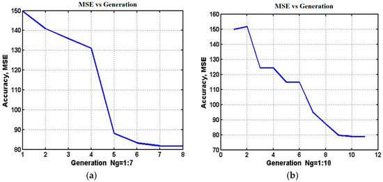 For Figure 6 and Figure 7 and Table 1 we report the standard deviation of the error (σ) and the bias; the mean squared error satisfies . In Section 4 we report MSE for the evolutionary runs.