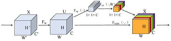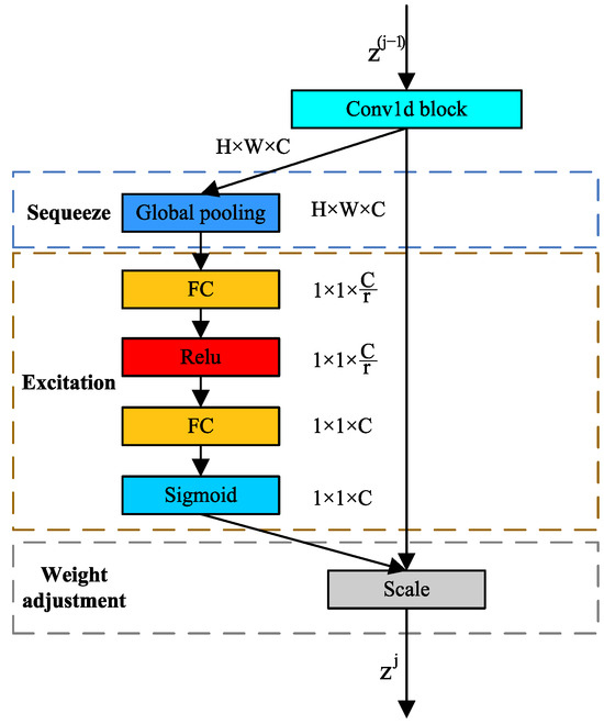 SENet is a channel attention mechanism [26] that selectively captures important feature information. It achieves this by examining and processing the correlations between feature channels. As a result, it dynamically modulates the dependencies across distinct attribute channels in convolutional neural networks. This makes it possible for the diagnostic model to modify the importance of each channel flexibly. It suppresses irrelevant channels, thereby improving the model’s diagnostic and representational capabilities. As illustrated in Figure 3, the core architecture of SENet is primarily built upon two essential operations: squeeze and excitation.