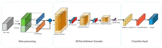 This section provides a formal description of the diagnostic model’s overall architecture and its key components. The model includes data processing, the SENet-Informer encoder, and the classification head. A schematic representation of the SENet-Informer diagnosis model is presented in Figure 4. This study presents a fault diagnosis approach for rolling bearings using an improved Informer model integrated with SENet. The data preprocessing is split into two components: Scalar and Position, aimed at extracting local features and preserving sequence order, respectively. The enhanced Informer encoder employs a combination of the ProbSparse Self-attention and Full Attention mechanisms, allowing it to effectively capture both local and global dependencies within the input sequence. To further improve feature extraction, Conv1d convolutional layers, Max Pool1d pooling layers, and the SENet module are used. The SENet module’s adaptive adjustment mechanism significantly enhances the precision and discriminative capability of the extracted features.