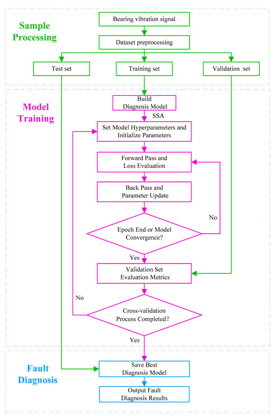 Figure 7 presents the comprehensive diagram of the fault diagnosis study. The entire procedure can be categorized into three phases. During the sample processing phase, the bearing vibration signals are initially preprocessed to remove noise and normalize the data. Following preprocessing, the samples are divided into subsets. This partitioning ensures that the data from both healthy and faulty bearing states are distributed across the training, validation, and test sets in distinct proportions, facilitating robust model training and evaluation. The diagnostic model is optimized during the training process using the Sparrow Search Algorithm (SSA) to identify the optimal hyperparameters [27].