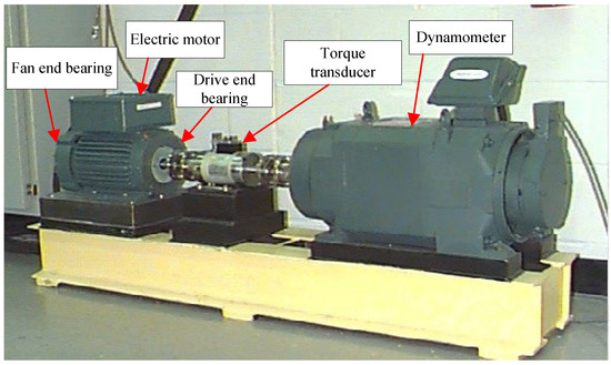 The CWRU bearing dataset is one of the most classical open-source datasets in the field of mechanical fault diagnosis, collected by Case Western Reserve University through an electrical machine testing platform [28]. The experimental platform, as shown in Figure 8, mainly consists of a motor, a torque sensor, a power meter, and an electronic controller. The bearing model tested in this study is the SKF-6205-2RS deep groove ball bearing, with simulated fault diameters of 0.007 inches, 0.014 inches, 0.021 inches, and 0.028 inches. The fault types considered include inner race fault, outer race fault, and rolling element fault. Data for this analysis were captured from the drive end, where the motor speed was 1750 rpm, the load was two hp, and the sampling frequency was 12 kHz.