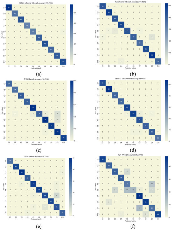 Confusion matrix results of the CWRU dataset for (a) SENet-Informer; (b) Transformer; (c) CNN-LSTM; (d) CNN; (e) LSTM; (f) TCN.