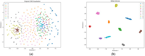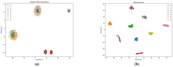 Two-dimensional visualization results of CWRU bearing dataset. (a) Original t-SNE visualization. (b) t-SNE visualization results of SENet-Informer.