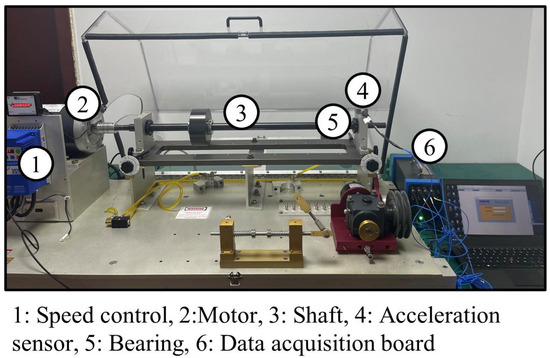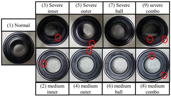 Figure 12 illustrates the HUST bearing dataset [30], which encompasses bearing fault tests performed using the Spectra-Quest mechanical fault simulator. From left to right on the test rig, the components include the speed controller, electric motor, shaft, accelerometer, bearing, and data acquisition board. The test bench does not incorporate a loading device. The ER-16K bearing model, presently under analysis, features a shaft diameter of 38.52 mm and a ball diameter of 7.94 mm and is employed to simulate bearing faults. As depicted in Figure 13, nine distinct bearing conditions are considered: (1) normal, (2) moderate internal fault, (3) severe internal fault, (4) moderate external fault, (5) severe external fault, (6) moderate ball fault, (7) severe ball fault, (8) moderate combined fault, and (9) severe combined fault. The combined fault involves both internal and external faults. The data used in this experiment were collected at a sampling frequency of 25.6 kHz under time-varying operating conditions with a bearing rotational speed of 0-40-0 Hz.