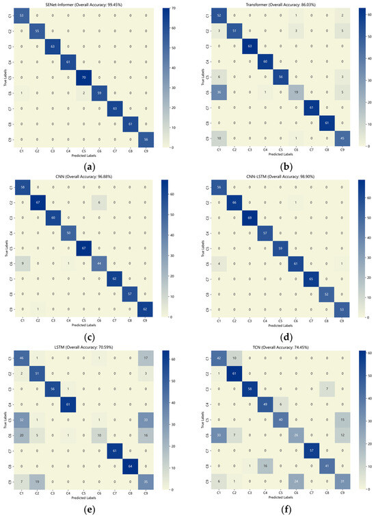 Confusion matrix results of the HUST dataset for (a) SENet-Informer; (b) Transformer; (c) CNN-LSTM; (d) CNN; (e) LSTM; (f) TCN.