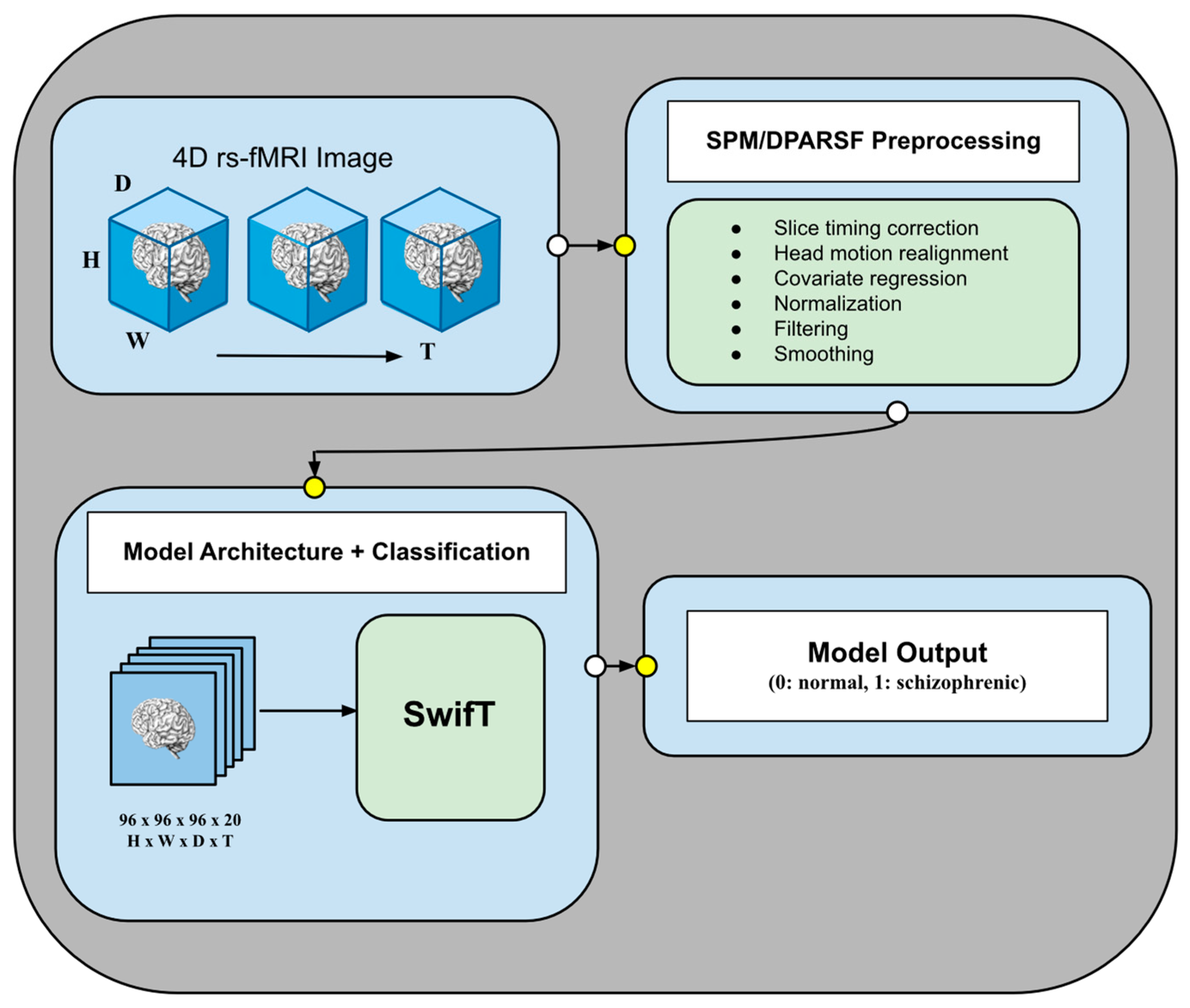 To address these challenges for our schizophrenia classification, we employ the Swin 4D fMRI Transformer (SwiFT)—an efficient, end-to-end deep neural network (DNN) for fMRI. Based on the Shifted-window Transformer architecture, SwiFT is a powerful model that enables learning brain dynamics directly from fMRI volumes [