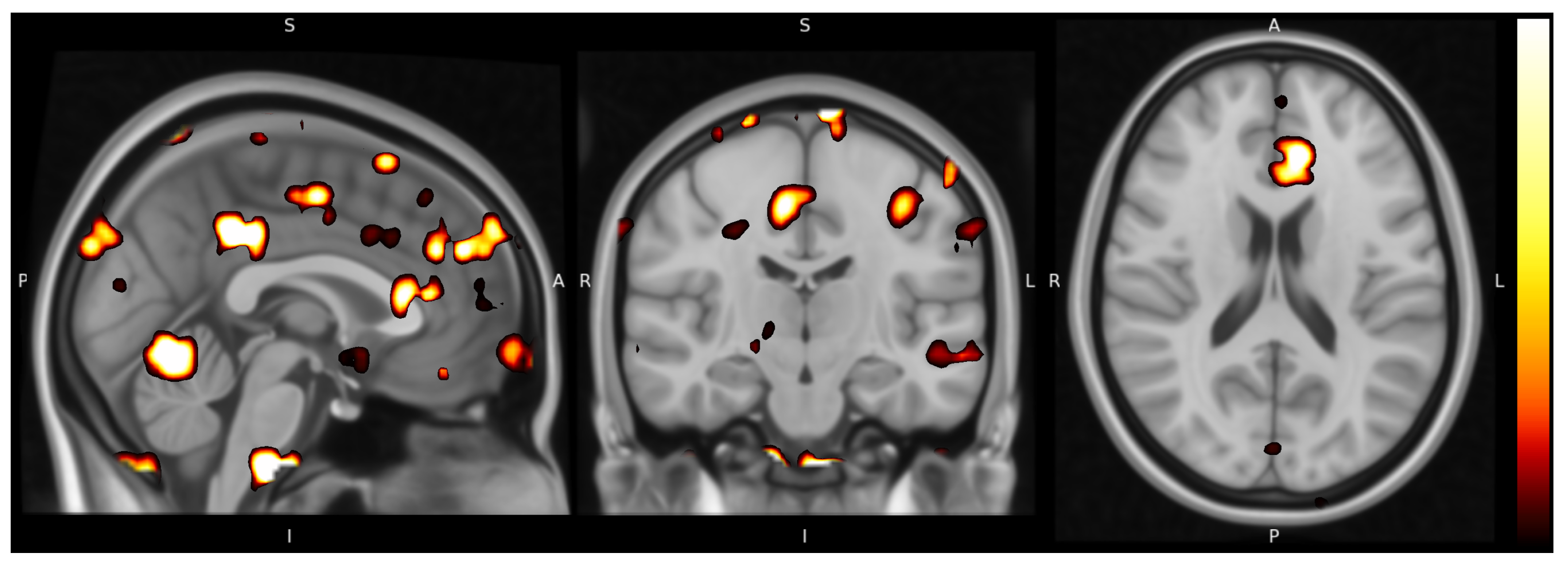 43]. Relevance maps were reshaped to match the MNI-152 2mm template dimensions (182 × 218 × 182) and overlaid onto the template. Maps were masked to include only voxels within the brain, with extraneous noise removed. Values were logarithmically scaled and thresholded between