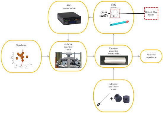 In Figure 1, the puncture path is first obtained through simulation and subsequently validated by physical experiments. The puncture experiments are carried out by mounting a puncture execution mechanism—with two degrees of freedom (rotation and feed)—at the end effector of a dual-arm robot and applying a duty-cycle control strategy. The Fiber Bragg Grating (FBG) sensor offers advantages such as high sensitivity, fast response, and good compatibility; therefore, it was selected for this design. Three optical fibers were used, arranged at intervals. Triangular grooves were created, and the fibers were embedded within them to form the core structure of the flexible needle. Based on the FBG sensing principle, the wavelength information is transmitted to the host computer via an FBG demodulator (model MOI si155) for real-time perception of the flexible needle’s shape and tip position, providing closed-loop feedback for the puncture robot’s path planning and puncture control. The sensor features a wavelength resolution of , a strain resolution of 1.2 , and a spatial resolution of , with an expected shape reconstruction accuracy at the sub-millimeter level. Regarding the puncture execution mechanism, the feed unit employs a two-phase stepper motor with a step angle of , driving the needle tube axially via a 0601 ball screw pair. The rotation unit utilizes a brushless DC motor (BLDC) controlled by field-oriented control (FOC) and is equipped with a 12-bit absolute encoder (resolution: 4096 counts/rev). After integration with the UR3 robotic arm, the actuator achieves an end-effector positioning accuracy within . The current and velocity control loops can operate at high frequency, and considering the mechanical inertia and resonance of the screw, coupler, and needle, the system bandwidth reaches 20–. The core contribution of this work lies in planning a puncture trajectory through simulation that conforms to the material characteristics of the flexible needle in a simulated puncture environment.