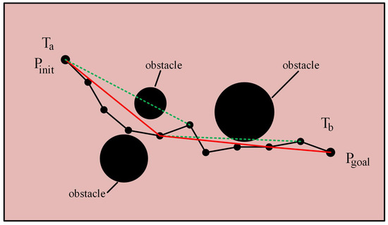 In the bidirectional fast expanding random tree algorithm, the generated path usually contains a large number of redundant nodes, resulting in a jagged path, which not only increases the path length, but also reduces the smoothness of the path and the efficiency of the motion of the flexible needle. In order to improve the quality of the path, this paper proposes a path optimization strategy, by pruning and interpolating the redundant nodes of the generated path to smooth the path, so that the path is more concise and smooth, which is closer to the kinematics of flexible needle puncture. The pruning process is shown in Figure 4, where the black dotted lines represent the original path, clearly depicting the initial traveling trajectory. The green lines, on the other hand, mark the regions in the path that are at risk of collision. After optimization, the final red solid path is obtained, which is a safe and efficient path after trimming and adjustment.