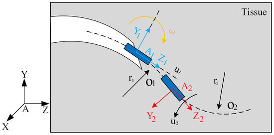 In this paper, a uniaxial puncture kinematic model is developed, as shown in Figure 5, in which the fixed inertial reference system AXYZ and the follower coordinate systems A1Y1Z1 and A2Y2Z2, which are solidly attached to the tip of the needle, are defined. In the needle body coordinate system, the Z1-axis is along the direction of needle body insertion, and the Y1-axis is perpendicular to the Z1-axis and in the direction opposite to the direction of needle body bending [31]. During the puncture process, the needle body produces a compound motion under the effect of tissue interaction force, including translational motion with velocity along the Z1-axis and rotational motion with angular velocity around the X1-axis, and the relationship between linear velocity v and angular velocity can be expressed as: