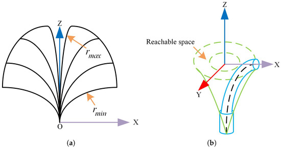During flexible needle puncture, the interaction between the needle and tissue causes the puncture path to be strongly influenced by the needle’s material properties and intrinsic curvature. Consequently, the planned path may not be achievable due to limited spatial accessibility. Therefore, path planning must consider the actual reachable workspace of the flexible needle and optimize inaccessible regions to ensure path smoothness, safety, accessibility, and optimality (i.e., minimal length). Owing to its structural characteristics, the flexible needle exhibits a maximum and minimum spatial bending radius, and , respectively, as shown in Figure 6. To guarantee path accessibility, the bending radius between any two consecutive puncture points, , must satisfy the following constraint: