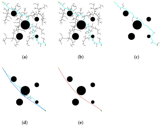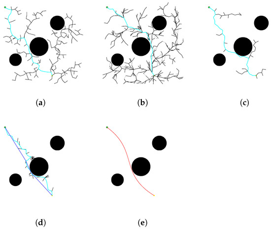 Schematic diagram of 2D path planning in the second type of simulation map environment. (a) is the RRT algorithm. (b) is the RRT* algorithm. (c) is the Bi-RRT algorithm. (d) is the GBOPBi-RRT algorithm. (e) is the fit path planned by GBOPBi-RRT.