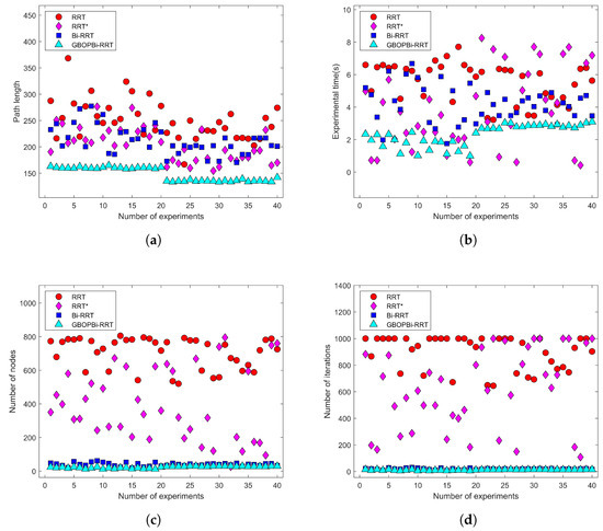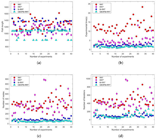 In order to more intuitively and fully verify the reasonableness and superiority of GBOPBi-RRT algorithm with the introduction of smooth fitting, we designed 40 sets of comparison experiments in the simulation environment and systematically collected four key indexes, namely, path length, running time, node size and iteration number. Figure 9a–d show the quantitative comparison results between GBOPBi-RRT and the other three mainstream algorithms in the above dimensions.