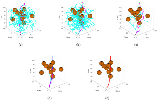 Schematic diagram of 3D path planning in the second type of simulation map environment. (a) is the RRT algorithm. (b) is the RRT* algorithm. (c) is the Bi-RRT algorithm. (d) is the GBOPBi-RRT algorithm. (e) is the fit path planned by GBOPBi-RRT.