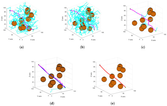 Schematic diagram of 3D path planning in the first type of simulation map environment. (a) is the RRT algorithm. (b) is the RRT* algorithm. (c) is the Bi-RRT algorithm. (d) is the GBOPBi-RRT algorithm. (e) is the fit path planned by GBOPBi-RRT.