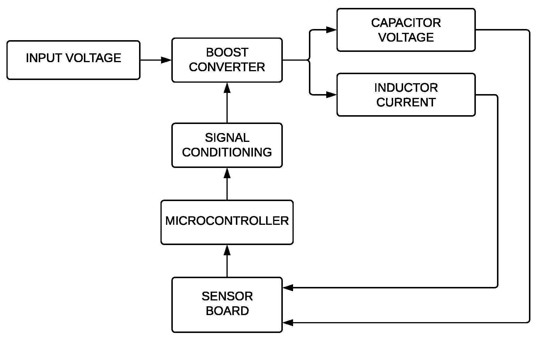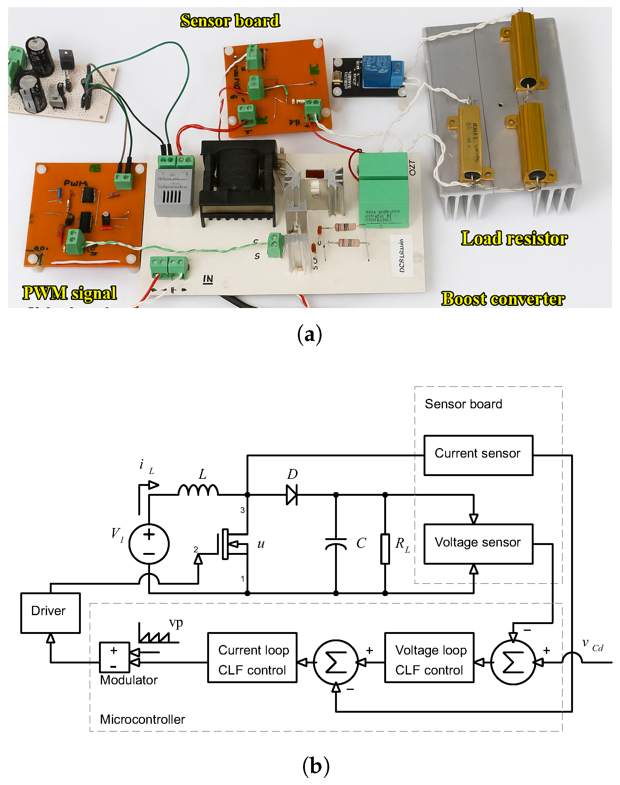 - Parada-Salado, J.G.; Herrera-Ramírez, C.A.; Soriano-Sánchez, A.G.; Rodríguez-Licea, M.A. Nonlinear Stabilization Controller for the Boost Converter with a Constant Power Load in Both Continuous and Discontinuous Conduction Modes. Micromachines 2021, 12, 522. [Google Scholar] [CrossRef] [PubMed]