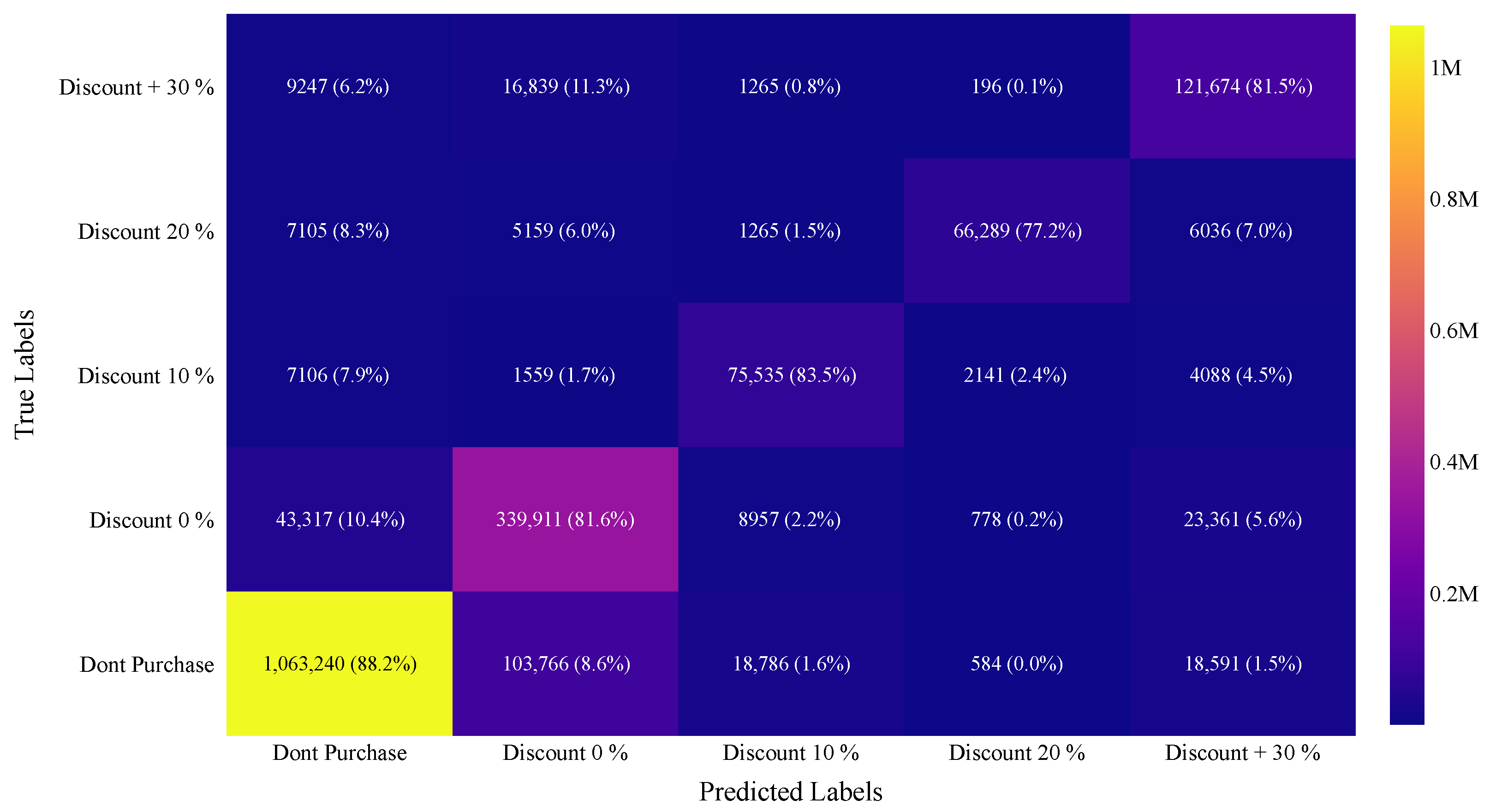 The model exhibits high precision for predicting non-purchase behavior (94.09%) and purchases with a 20% discount (94.71%), indicating that it accurately identifies customers in these categories. This precision is critical for minimizing false positives and ensuring that marketing resources are effectively utilized. However, the precision for predicting full-price purchases (72.7%), purchases with a 10% discount (71.3%), and high-discount purchases (70.02%) is moderate, suggesting areas for improvement to enhance the accuracy of these predictions.
