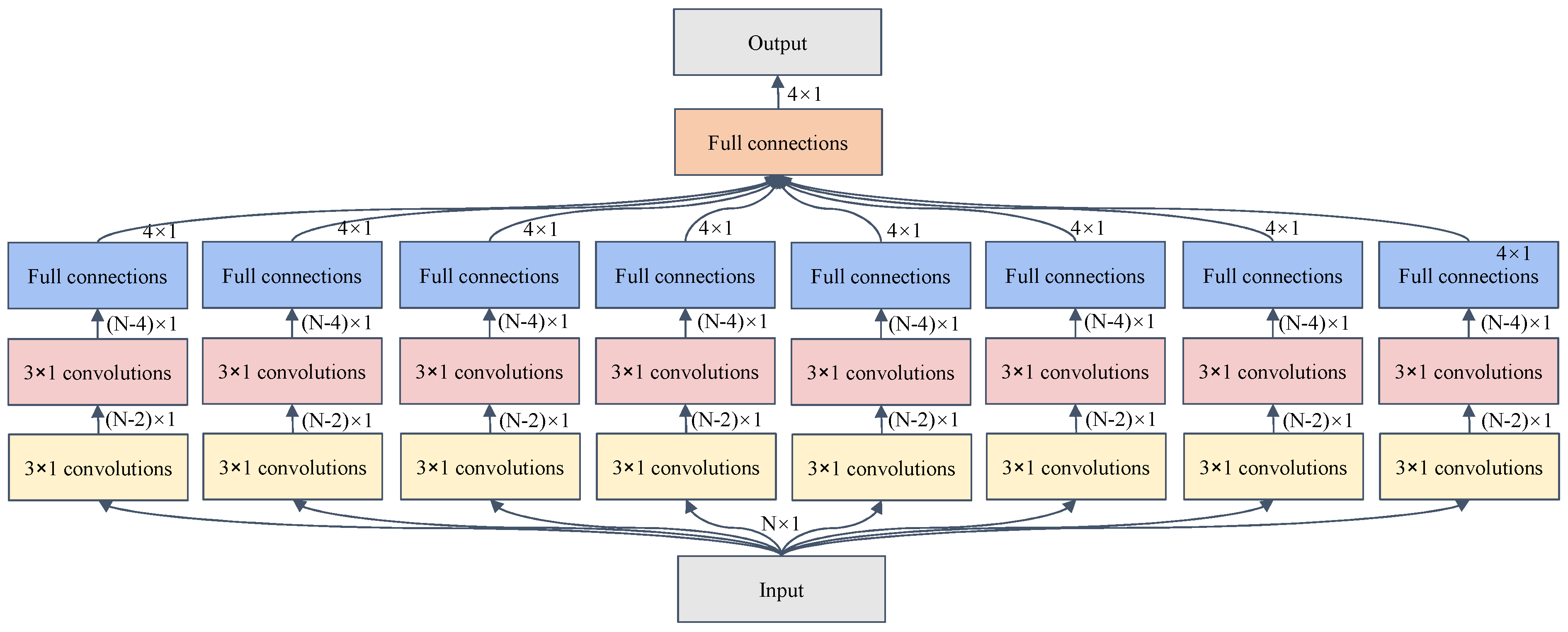 During the inference phase, the forward propagation complexity of MBCNN for a single sample is also , specifically derived from the convolutional and fully connected operations of each branch (each branch , with 8 branches operating in parallel) and the constant computation of the fusion layer . Thus, the inference complexity is , exhibiting a linear relationship with the input feature size N, which is also the same as the single-branch CNN.