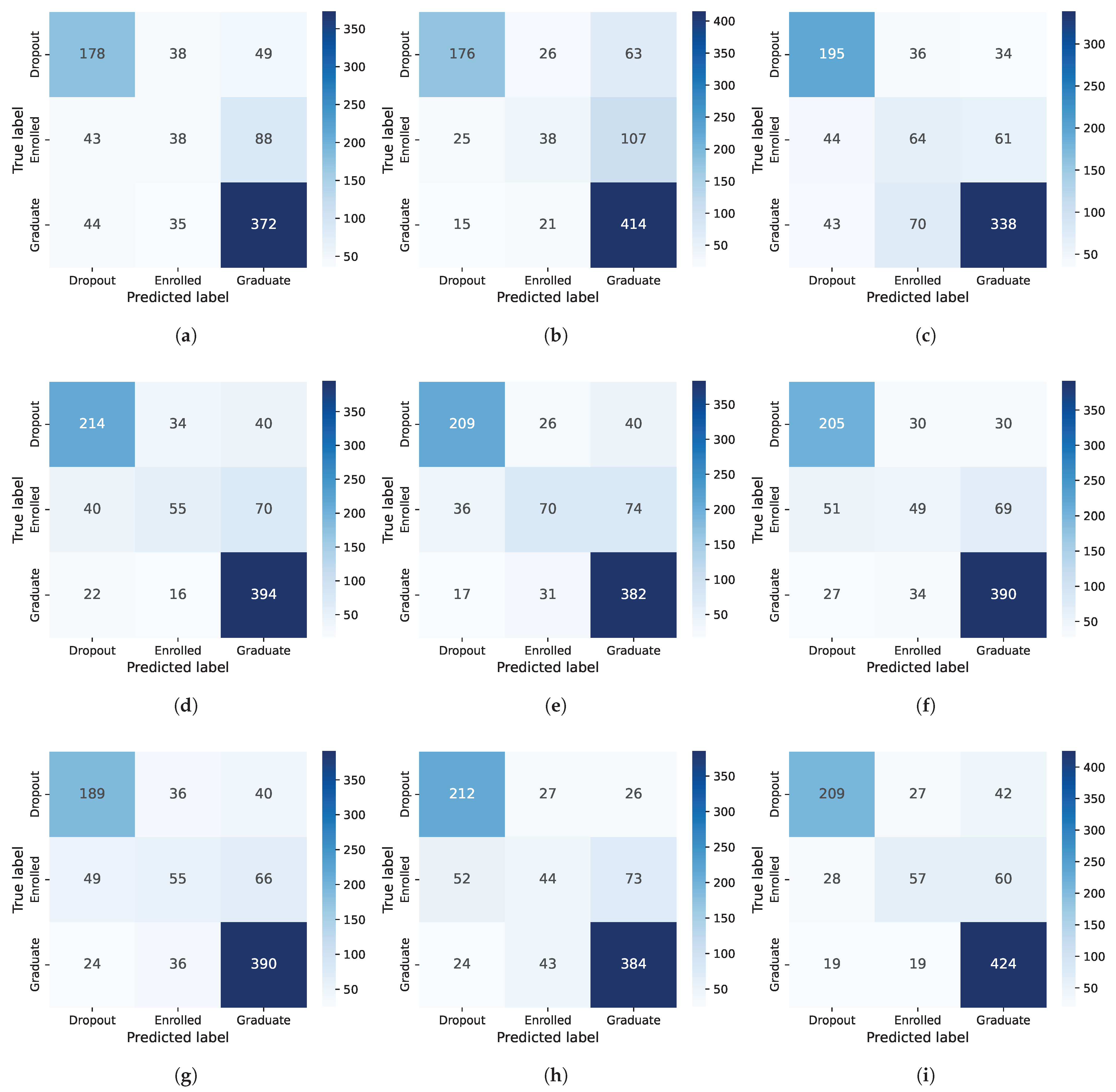7] for experimental validation. This dataset contains anonymized student information spanning multiple years, covering multiple dimensions such as individual student characteristics, school resources, family background, and societal factors. The dataset comprises a total of 4424 student samples (enrolled between the academic years 2008/2009 to 2018/2019). Each sample consists of 36 raw features and one academic status. The features primarily consist of information known at the time of student enrollment, including aspects such as academic background, demographic profiles, and socioeconomic factors, along with records of academic performance at the conclusion of the first and second semesters. This comprehensive dataset effectively captures multiple contextual dimensions influencing student academic progression. The academic status is categorized into three distinct outcomes: Dropout, Enrolled, and Graduate. This classification effectively captures the key transitional states in a student’s academic journey. Specifically, “Dropout” refers to students who discontinue their studies before completing the program. “Enrolled” describes students who are actively continuing their education but have not yet met all graduation requirements. “Graduate” denotes students who have successfully fulfilled all academic criteria and have been awarded their degree. This clear three-class categorization is crucial for the predictive modeling task, as it allows for the development of targeted intervention strategies and provides a comprehensive view of student progression.