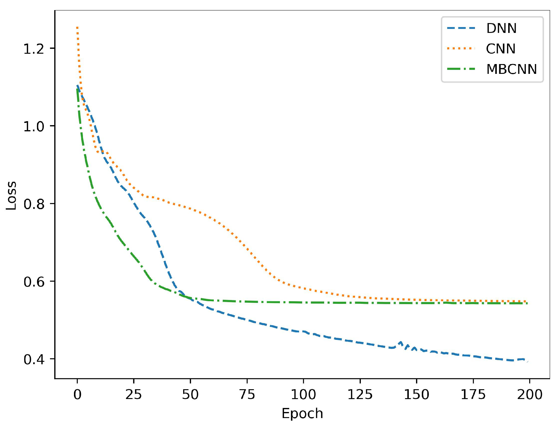 Figure 7 presents the loss function convergence curves of the three deep learning approaches (DNN, CNN, and MBCNN). The graph clearly demonstrates that MBCNN achieves significantly faster convergence compared to the other two models. This indicates that our multi-branch architecture facilitates more stable gradient flow and more efficient parameter optimization during the training process, enabling the model to rapidly approach a favorable optimization region.