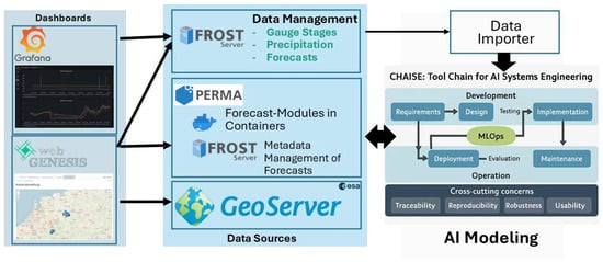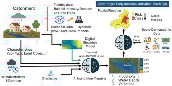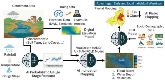 Hydraulic simulations (HEC-RAS): Model water surface profiles and flood extents []. AI-forecasted water levels and discharge: Derived from hybrid models combining ANN and physical simulations []. Radar-based precipitation forecasts: Provided by DWD and ECMWF for short-term flood prediction []. Extreme weather indices and warnings: Integrated from national alert systems (e.g., KATWARN, MeteoAlarm) []. Climate models and scenario projections: Used for long-term flood risk planning [].