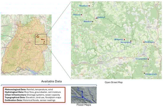 The underlying architecture and training methodology of both models are described in detail in our previous publications [] and briefly summarized here for context. Figure 3 and Figure 4 illustrate the respective model workflows for fluvial and pluvial flood forecasting.