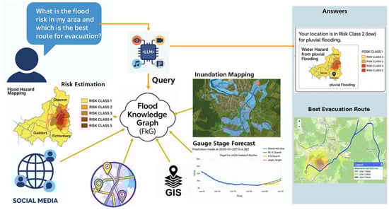 A unique way to close these gaps is with Large Language Models (LLMs), especially those integrated into Retrieval-Augmented Generation (RAG) architectures. Large volumes of textual and multimodal data can be synthesized by LLMs, facilitating context-aware, real-time communication and decision support [,]. LLMs can produce customized warnings, summaries, and strategic recommendations by querying a Flood Knowledge Graph that integrates various datasets, such as historical events, EU flood directives, GIS layers, and reactive measure catalogs [].