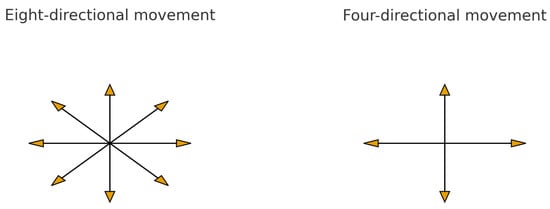 Directions: Manhattan distance utilizes four primary directions, as shown in Figure 1 (right), while diagonal distance incorporates eight directions, as shown in Figure 1 (left). As shown in Figure 2, algorithms are modified to pass through any dimensions rather than being limited to specific directions. When applying Manhattan movement from point (S) to point (G), six scenarios—(a–f)—arise, each with identical step counts and costs. However, the calculations differ due to rotation incurring higher costs than forward movement. Only two paths, (a) and (b), achieve the best path with minimal rotation, while the other four paths, (c–f), add additional costs. Path planning begins by selecting parameters such as the angle of motion, distance, and heading. Two types of path parameters are distinguished: the four directions of motion shown in Figure 1 (left), and eight directions for Figure 1 (right). Optimizing the path involves considering both distance and time metrics to determine the most efficient route.