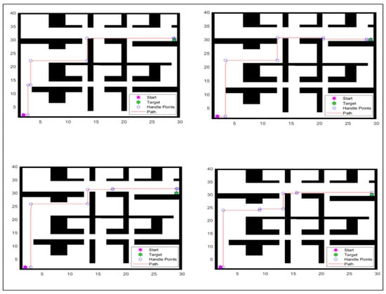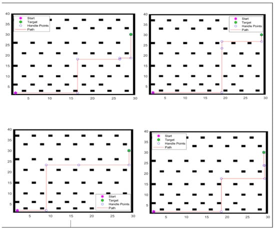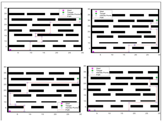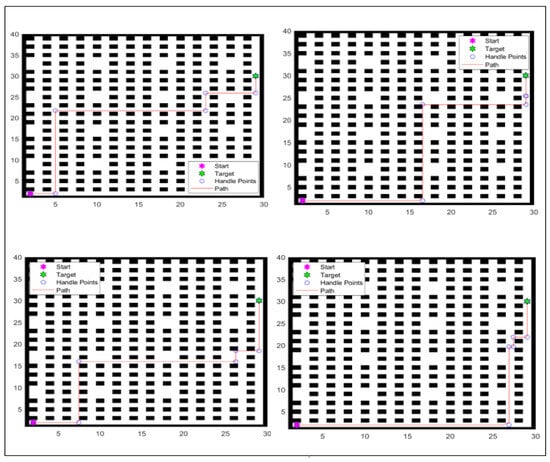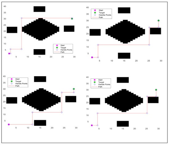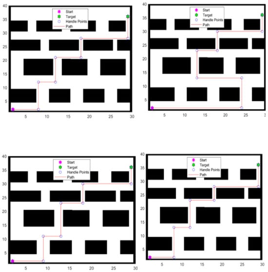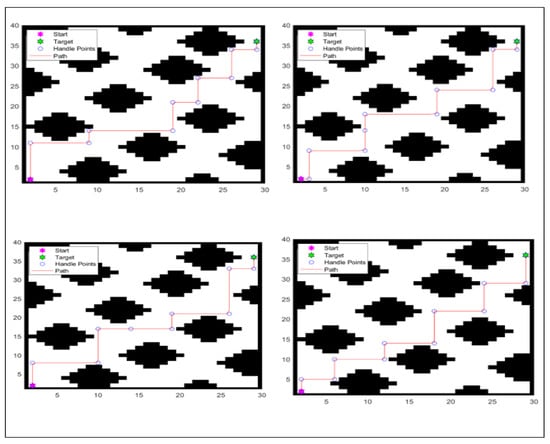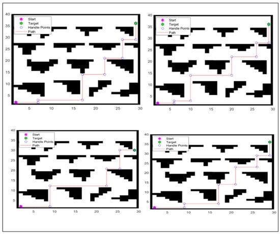 The purpose of this experiment was to show that traditional AI methods like A* and Dijkstra can solve path-planning problems. However, the remaining experiments concentrated on metaheuristic algorithms. Figure 4 shows the results of four experiments for this experiment, along with a grid background for the user to understand the mobile robots’ movements.